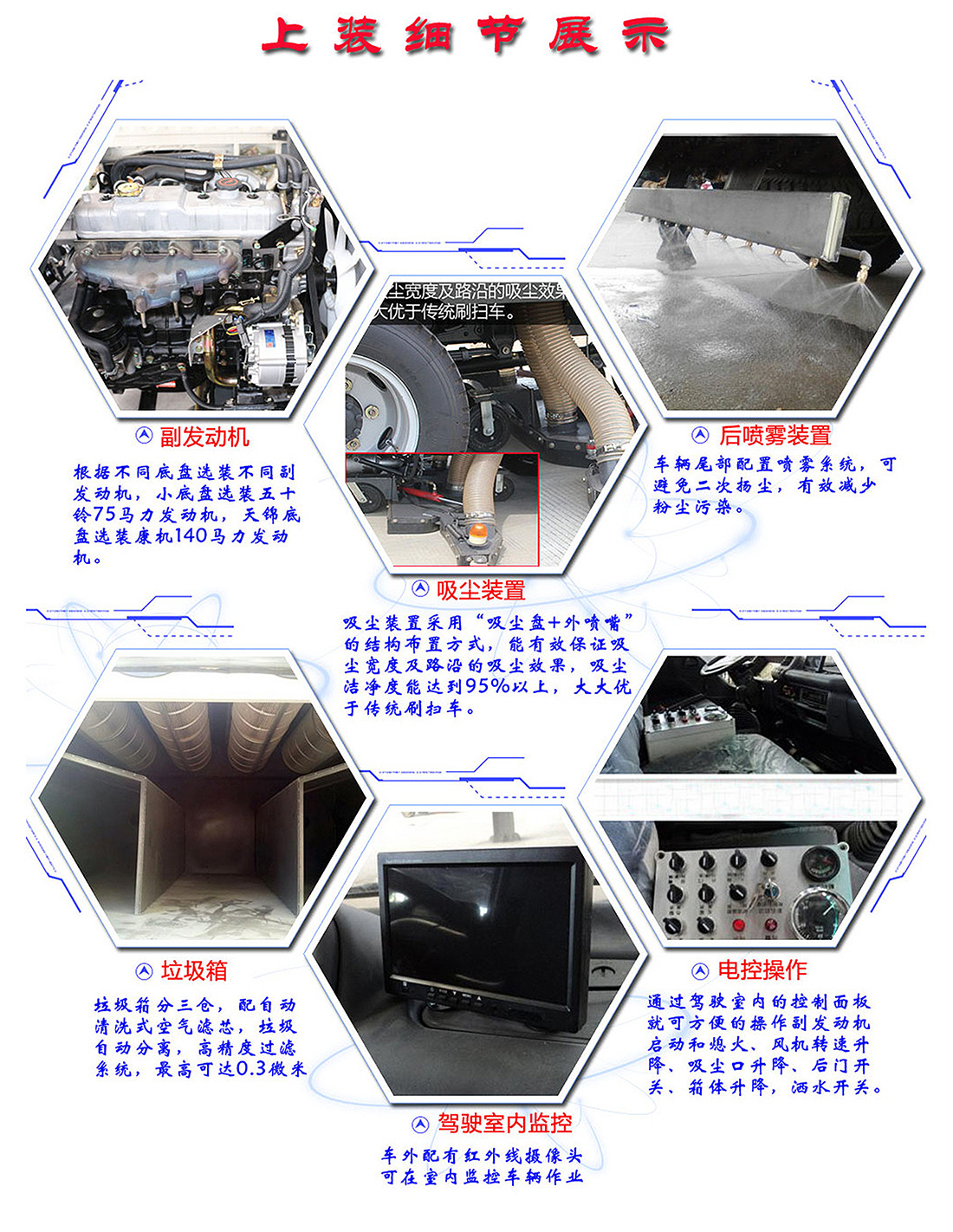 五十鈴10方吸塵車上裝配置:水箱3方,塵箱7立方,吸塵寬度3米,吸塵速度3-15公里每小時,吸入顆粒110mm,駕駛室內(nèi)全電腦觸屏控制,灰塵過濾器,進(jìn)口脈沖除塵,車尾噴霧降塵裝置。 適合場合:適合于中小型廠區(qū)路面除塵作業(yè),無揚(yáng)塵,可達(dá)到環(huán)保要求。