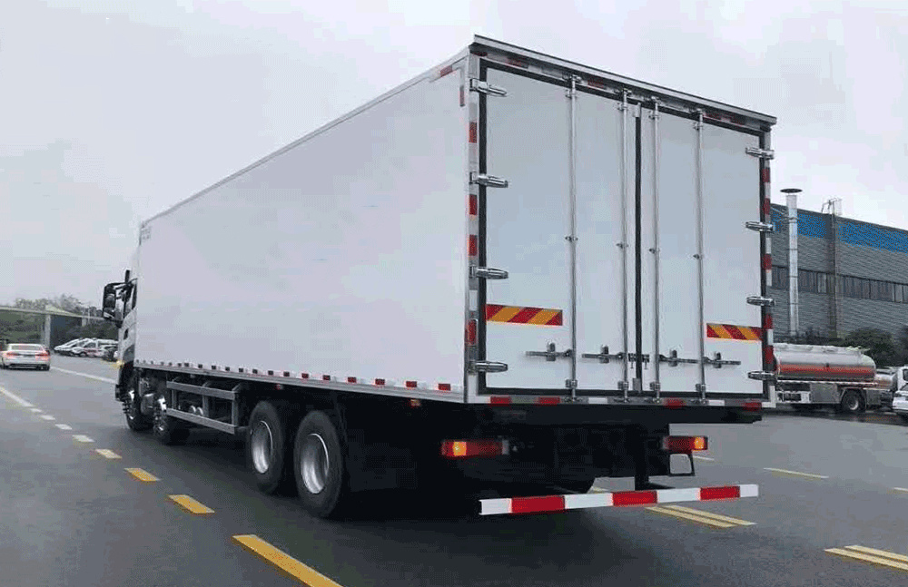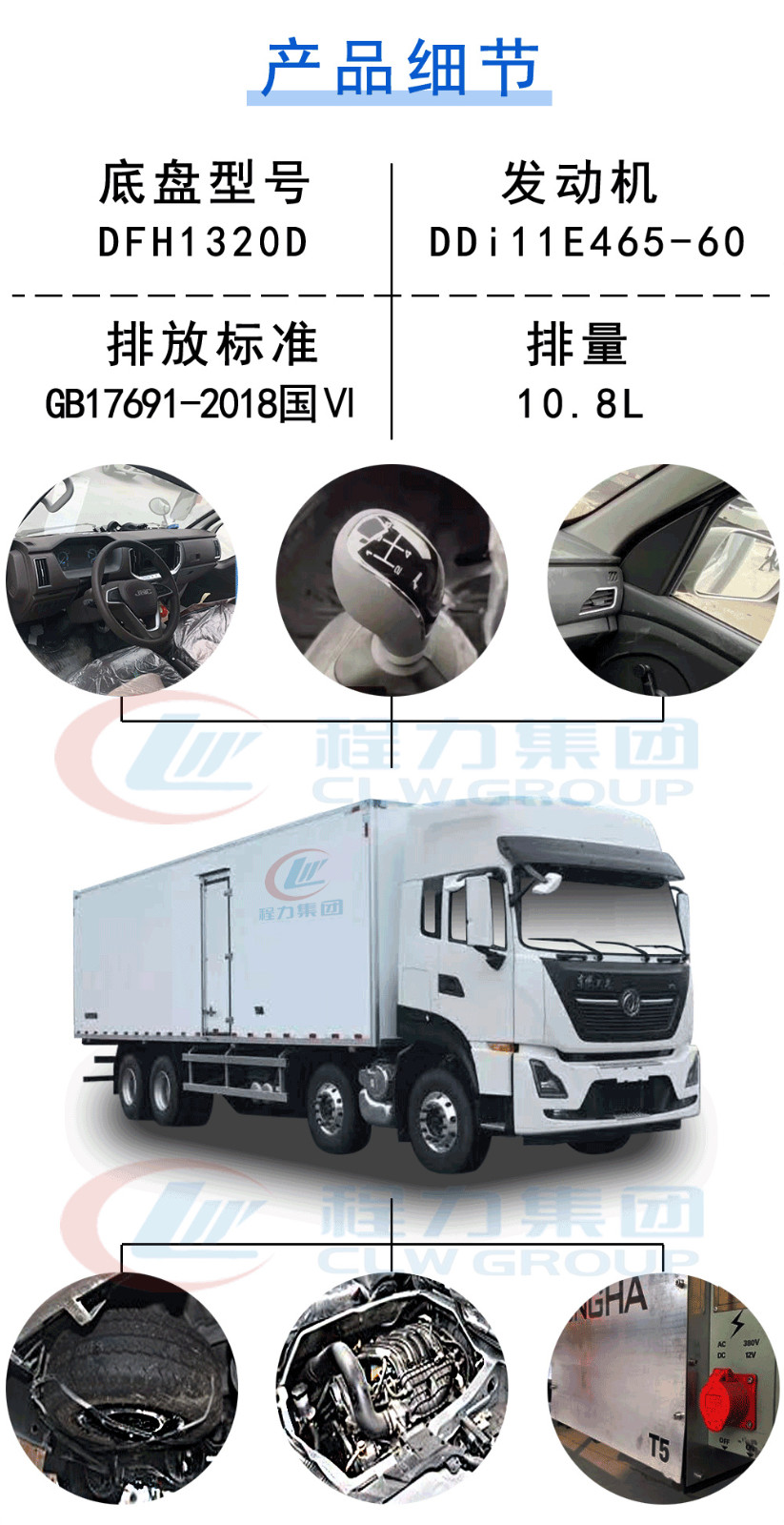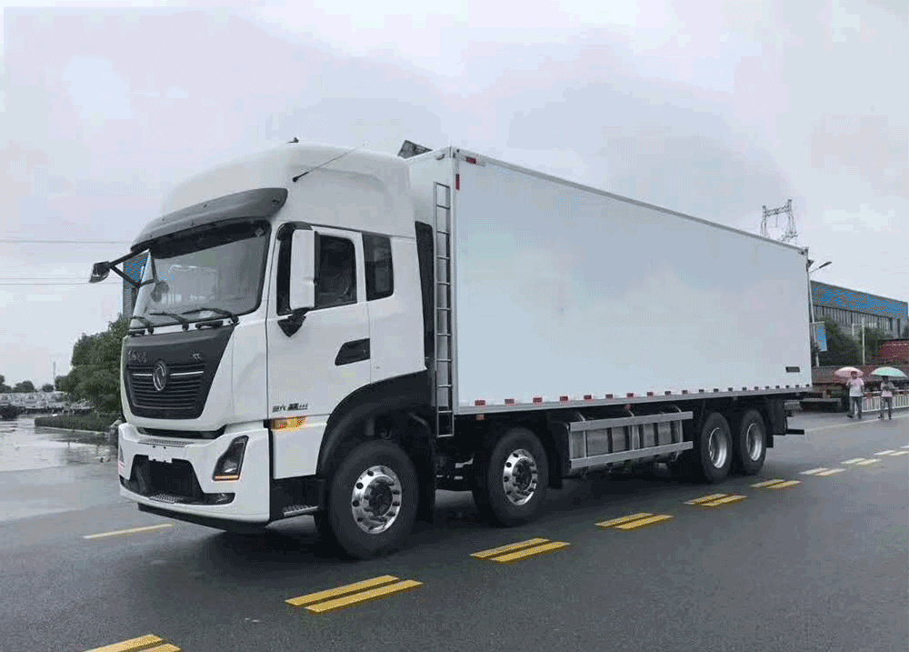 | 其他 | 隨底盤選裝僅高度不同的駕駛室,高頂駕駛室頂部氣喇叭為選裝件,駕駛室前角擾流板為選裝件,選裝單油箱或雙油箱;貨廂選裝單開門,雙開門和不開門型式;選裝其它廠家功率相當?shù)闹评錂C組,選裝前置式,內(nèi)置式,底置式制冷機組;選裝升降尾板,尾板收起狀態(tài)時的水平長度為295mm;廂體頂部封閉,不可開啟;側(cè)防護:材料Q235,螺栓連接;后下防護:材質(zhì)Q235.螺栓連接,斷面尺寸120×60mm,離地高度460mm;安裝具有衛(wèi)星定位功能的行駛記錄儀;裝有ABS,ABS型號/生產(chǎn)廠家:ABS 8/東科克諾爾商用車制動系統(tǒng)(十堰)有限公司;發(fā)動機DDi11E465-60對應(yīng)油耗申報值37.1L/100km. | ||