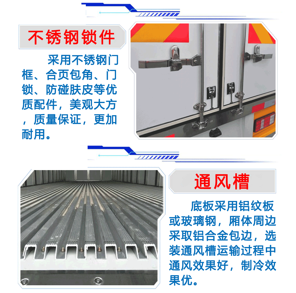 上裝配置:箱體采用內(nèi)外玻璃鋼,中間8cm厚高密度保溫板,不銹鋼鎖件、門框、鉸鏈,鋁合金型材包邊、包角、陰角條,隔溫條,鋁花紋底板。